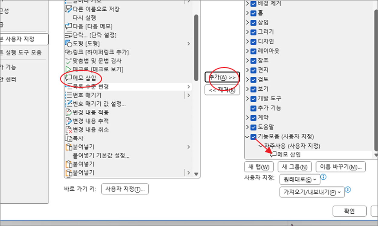 ▼ 그룹 내에 추가할 리본 메뉴를 왼쪽 목록에서 찾습니다. 그리고 두 목록 중간에 “추가” 버튼을 클릭합니다. 오른쪽 목록에서 선택한 위치로 리본 메뉴가 추가가 됩니다.
