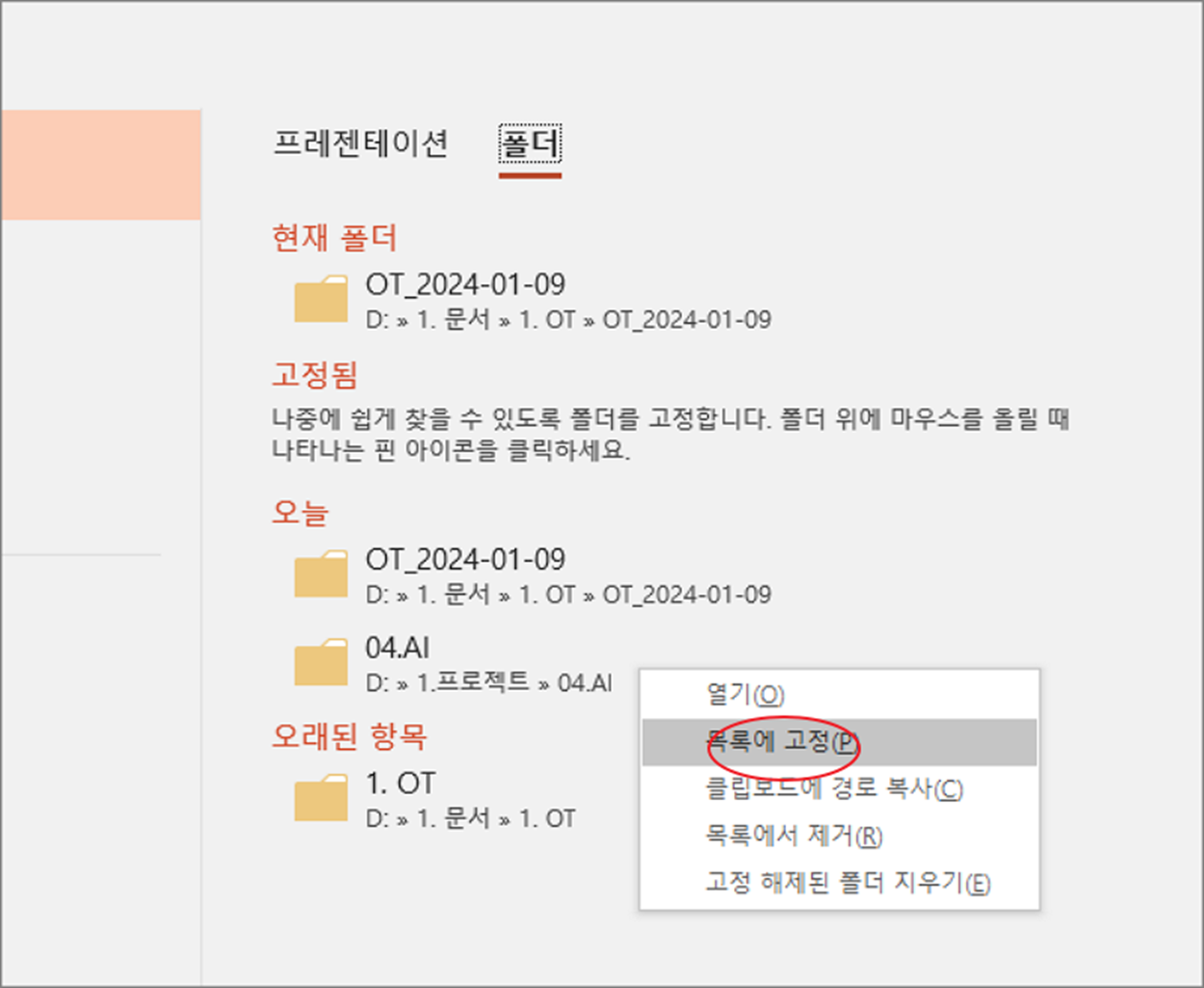 ▼ 파일 뿐만 아니라 폴더도 상단에 고정이 가능합니다. “폴더” 탭으로 이동해서 고정을 원하는 폴더 제목을 찾습니다. 그리고 오른쪽 마우스를 눌러 “목록에 고정” 을 선택합니다.