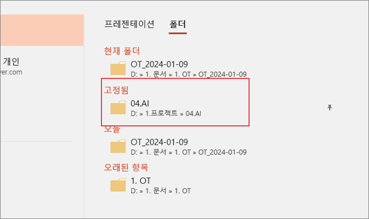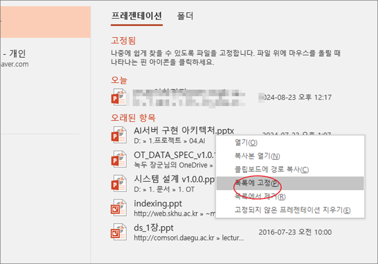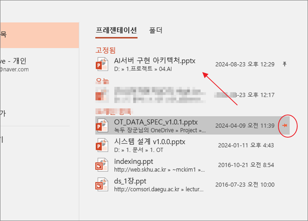 ▼ 결과는 아래와 같습니다. 상단에 “고정됨” 항목에 추가한 파일이 추가가 됩니다. 또 다른 방법은 파일 제목에 마우스를 가져가면 나타나는 핀 아이콘을 클릭해서 고정하는 것입니다.