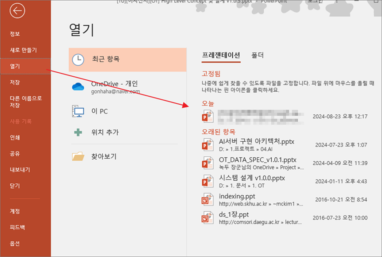 ▼ 파일 탭 화면에서 왼쪽 사이드 패널에서 “열기” 메뉴를 찾아 클릭합니다. 오른쪽 화면에는 최근 문서 목록을 정렬해서 보여줍니다.