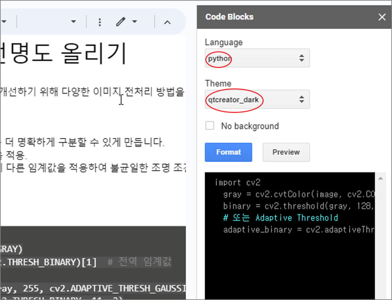 구글 문서 도구에서 코드 블록은 코드의 가독성을 높이고, 구문 강조를 통해 코드의 의미를 명확히 합니다. 그리고 형식을 유지하여 원래의 구조를 보여주고, 팀원과의 공유 및 협업을 용이하게 하기 위함입니다. 저는 문서에 코드는 다크모드로 변경해서 보는 것이 익숙해서 항상 아래와 같이 플러그인을 이용해서 편집합니다.