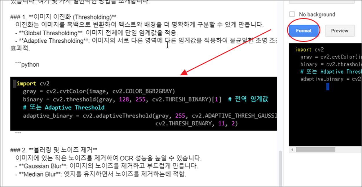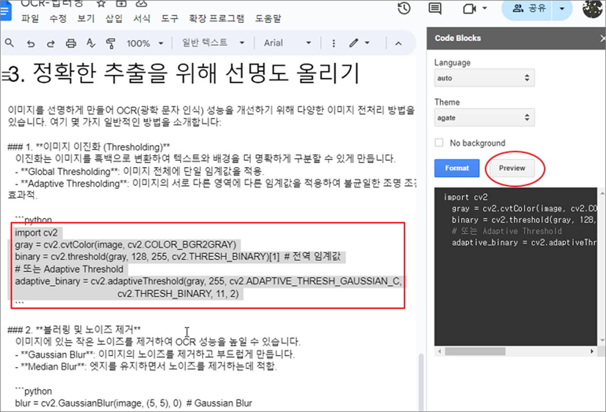 ▼ 다음 왼쪽에서 적용할 텍스트 영역을 드래그 해서 선택합니다. 그리고 오른쪽 Code Blocks 화면에서 Preview 버튼을 눌러 원하는 형태대로 표현이 되는지 확인합니다.
