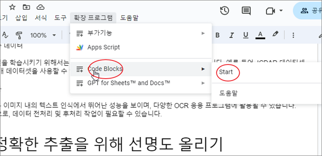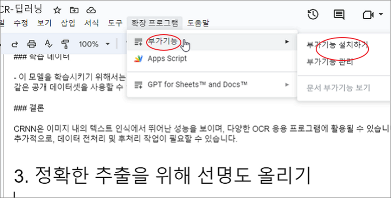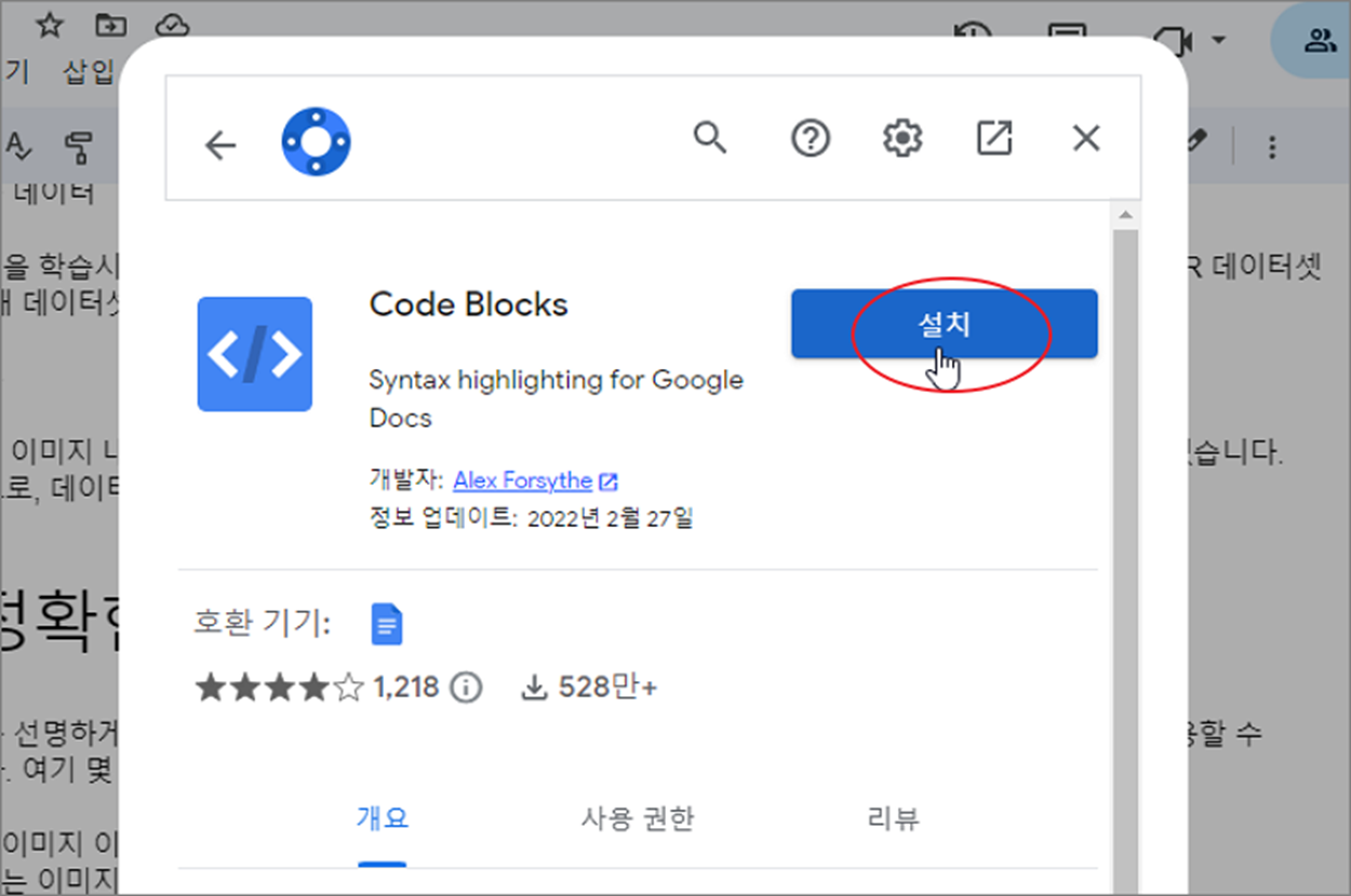 ▼ 먼저 코드 블록을 쓰기 위해서는 부가기능을 설치해야 합니다. 구글 문서 도구 상단에 확장 프로그램 > 부가기능 > 부가기능 설치하기 메뉴를 클릭합니다.