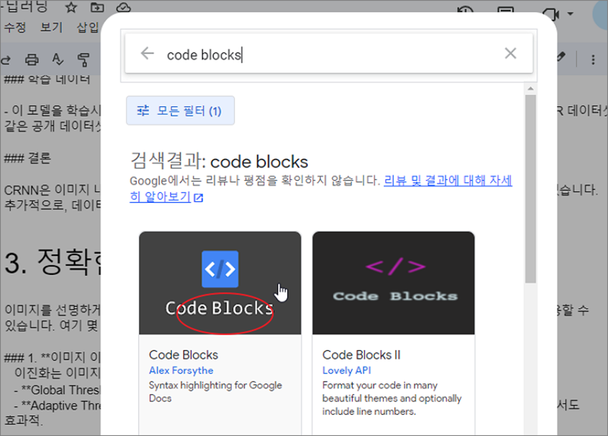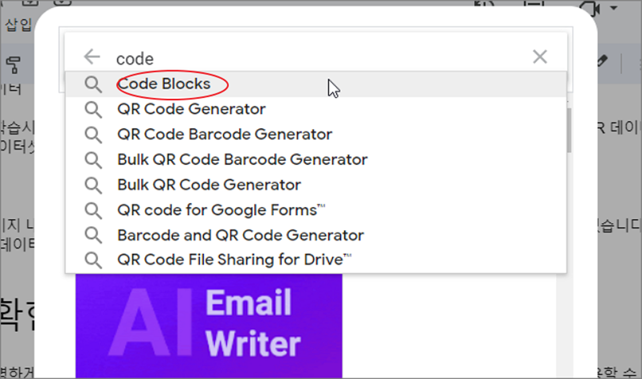 ▼ 다음은 여러 부가 기능 중에서 내가 필요로 하는 코드 블록 툴을 찾아야 합니다. 검색란에 code blocks 를 찾아서 선택합니다.