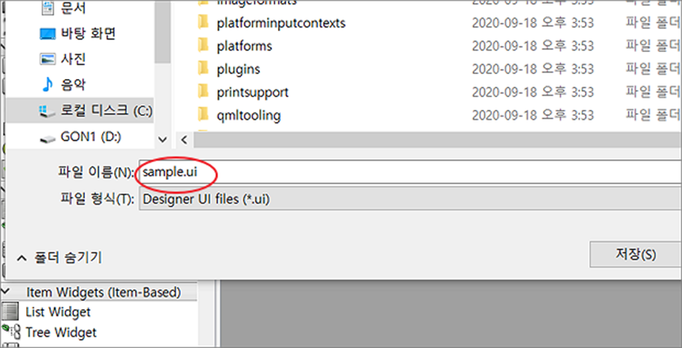 ▼ 화면을 구성하고 세부 속성 정보까지 수정이 끝났다면 파이썬 프로그램에서 활용하기 위해 파일을 저장합니다. 확장자는 UI 입니다.