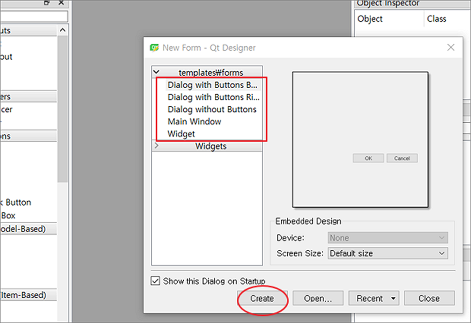 ▼ 처음 화면을 만들기 위한 템플릿 종류는 크게 3가지로 나눌 수 있습니다. QMainWindow, QDialog, QWidget 중 하나를 기반으로 화면을 생성합니다. 템플릿 목록에 나와 있는 것도 3가지 종류 중 하나입니다. 어떤 위젯을 기반으로 한 템플릿을 선택할 것인지 정했다면 아래로 내려가서 Create 버튼을 클릭합니다.