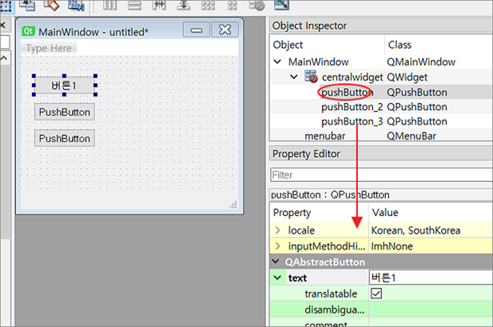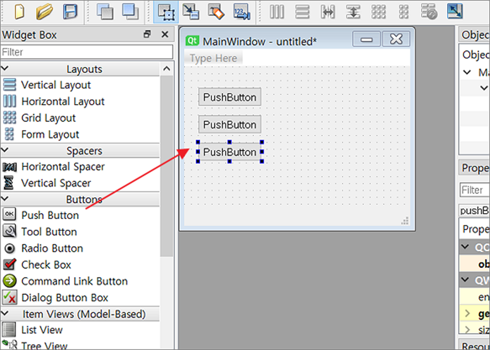 ▼ 화면 구성이 끝났다면 각 위젯의 상세 설정값은 속성 정보 패널에서 할 수 있습니다. 컨트롤을 선택하면 해당 속성 정보는 오른쪽 패널 화면에 나타납니다. Object 를 선택하고 아래로 내려가서 속성 정보를 수정합니다.