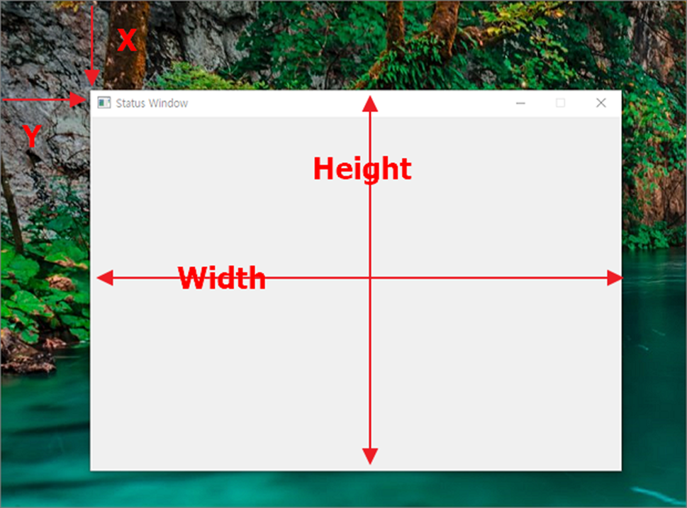 ▼ QMainWindow 의 setGeometry(x, y, width, height) 는 윈도우 화면에서의 위치를 결정 짓습니다. 기준은 윈도우 바탕화면입니다. 4개의 인수를 입력해야 되는데, 각 요소는 다음과 같습니다. QWidget 의 함수이기 때문에 QMainWindow 에서도 동일하게 사용할 수 있습니다.