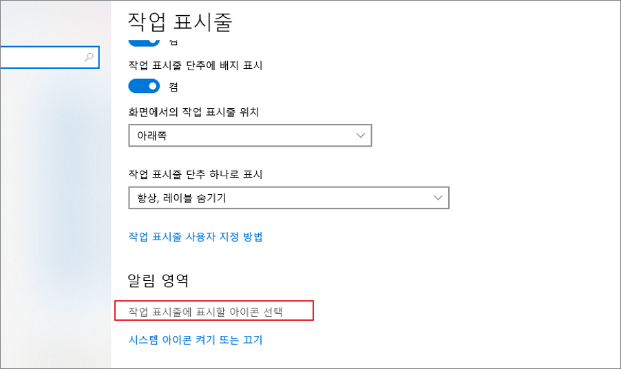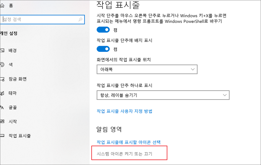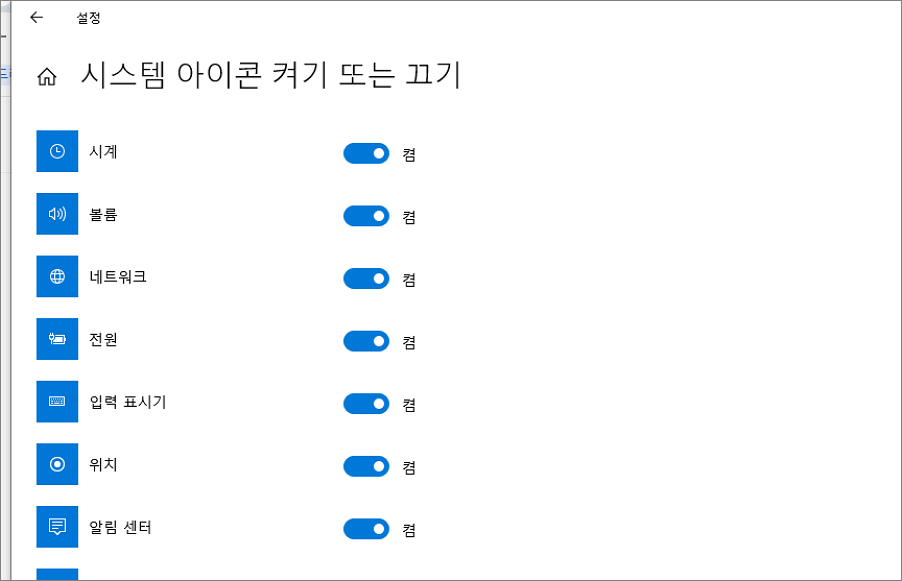 작업 표시줄 우측에는 볼륨, 네트워크, 배터리, 시계 등의 시스템 아이콘이 표시됩니다. 설정 > 개인 설정 > 작업 표시줄 > 시스템 아이콘 켜기 또는 끄기로 이동하면 각 항목별 표시 여부를 조정할 수 있습니다. 꼭 필요한 아이콘만 남기면 화면이 훨씬 정돈되고 집중하기 쉬워집니다.