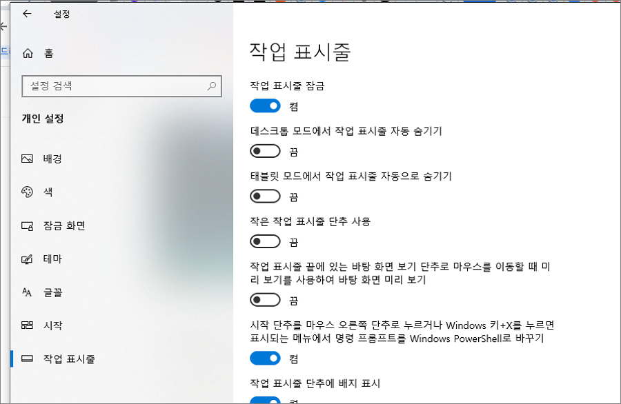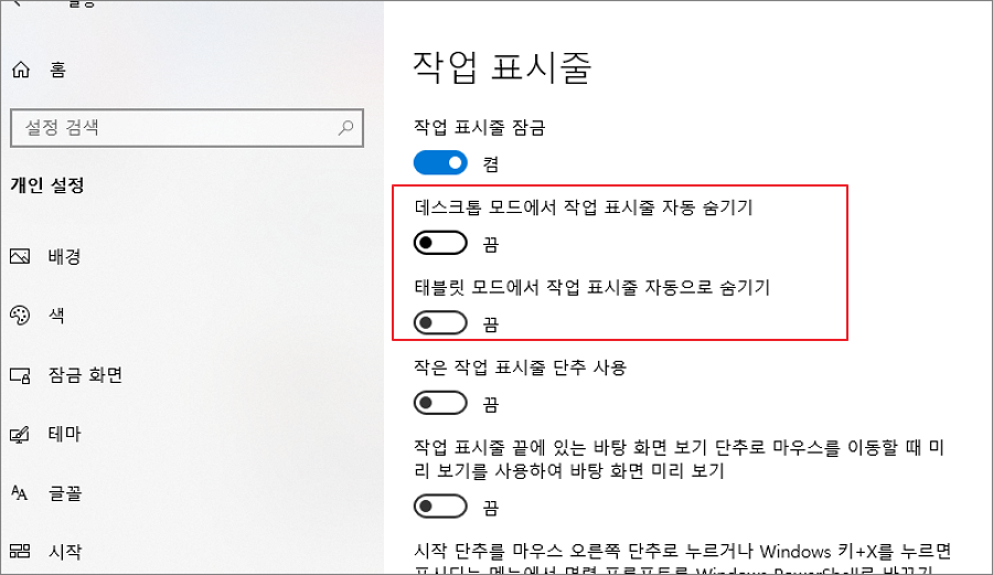 화면 공간을 넓게 활용하고 싶다면 작업 표시줄 자동 숨김 기능을 활성화해보세요. 설정 > 개인 설정 > 작업 표시줄로 이동해 ‘데스크톱 모드에서 작업 표시줄 자동 숨기기’를 켜면 마우스를 아래쪽으로 가져가기 전까지 표시줄이 보이지 않게 됩니다. 작은 화면을 사용하는 사용자에게 특히 유용한 설정입니다.