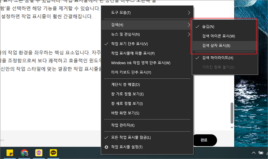 작업 보기 버튼과 검색창도 사용자 설정에 따라 표시 또는 숨길 수 있습니다. 작업 표시줄에서 빈 공간을 마우스 오른쪽 클릭한 후 ‘작업 보기 버튼 표시’, ‘검색 > 표시 안 함’을 선택하면 해당 기능을 제거할 수 있습니다. 특히 검색 창은 공간을 많이 차지하므로 ‘아이콘만 표시’ 또는 ‘숨기기’로 설정하면 작업 표시줄이 훨씬 간결해집니다.