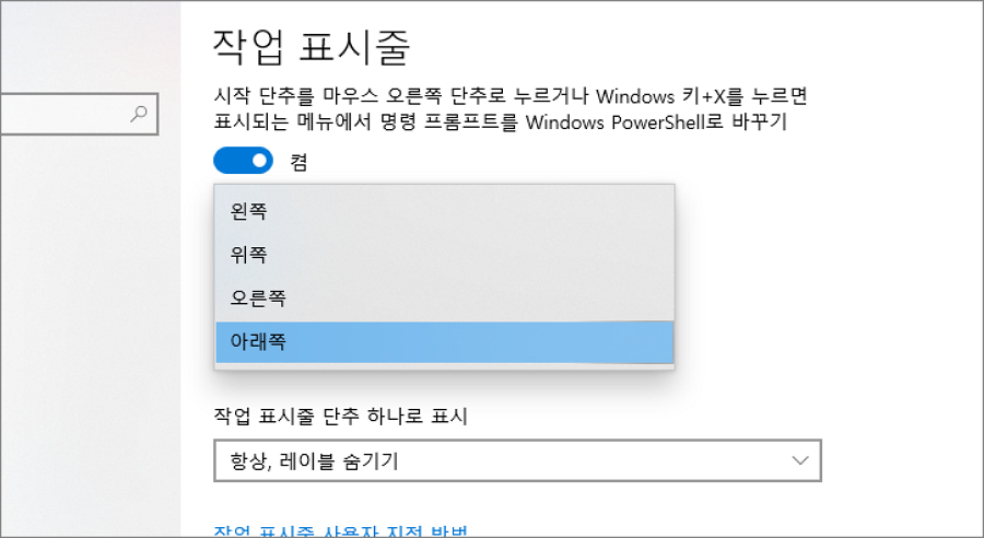 ‘작업 표시줄 위치’를 드롭다운 메뉴로 조정할 수도 있습니다. 모니터 크기나 작업 방식에 따라 위치를 바꾸면 작업 효율성이 달라질 수 있습니다.