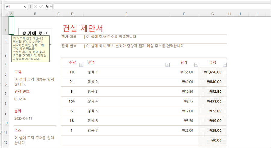 다음은 견적서 서식입니다. 제품명, 수량, 단가를 입력하면 자동으로 금액이 계산되고, 총합도 자동으로 정리됩니다. 견적 요청 고객에게 보낼 서류로도 손색없을 만큼 깔끔한 문서를 손쉽게 만들 수 있습니다.
