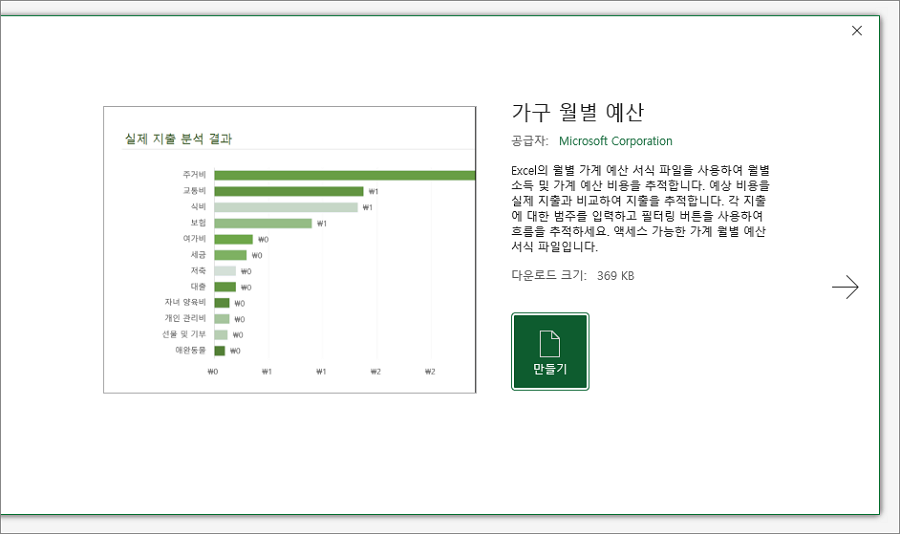 추천 서식을 클릭하면 미리보기 화면과 함께 ‘만들기’ 버튼이 나타납니다. 클릭하면 엑셀 파일이 열리고 기본값이 채워진 상태로 시작됩니다.