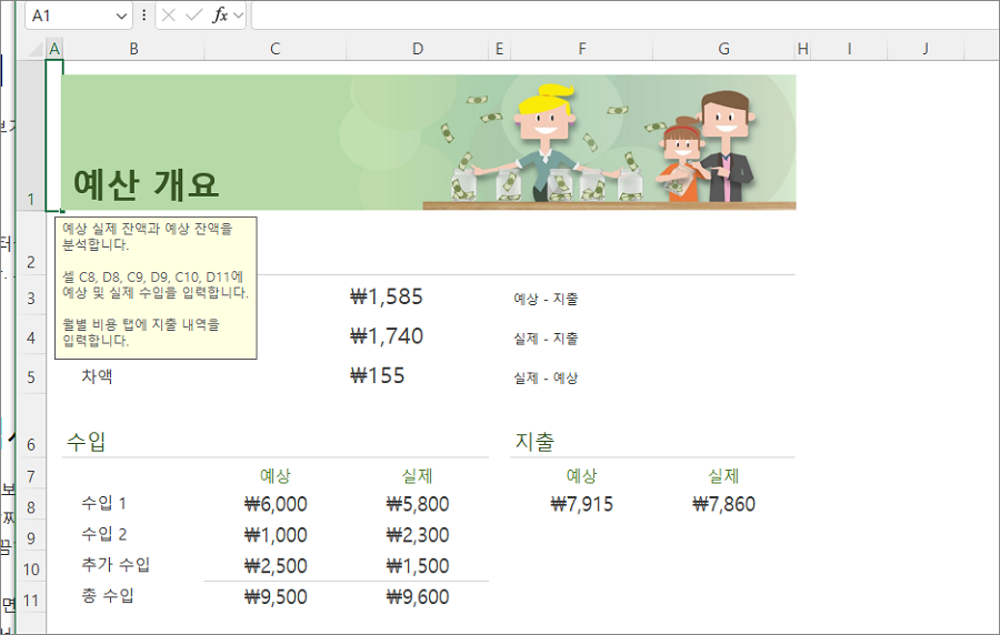 이제 필요한 부분에 내 데이터를 입력하면 됩니다. 예를 들어 가계부 서식에서는 날짜, 지출 항목, 금액을 입력하기만 하면 자동으로 합계가 계산됩니다. 표 스타일이나 셀 색상 등은 필요에 따라 변경할 수 있으므로, 원하는 형태로 커스터마이징이 가능합니다.
