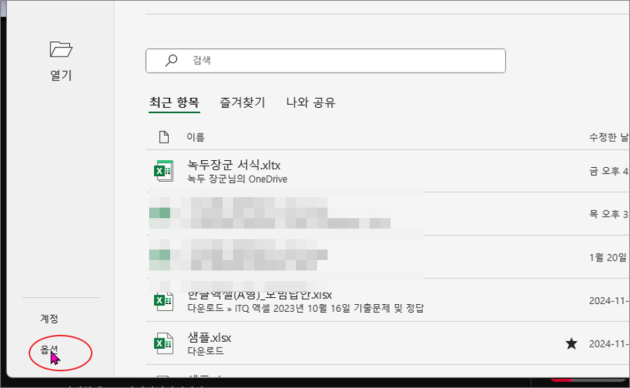 엑셀 프로그램이 실행된 상태에서 왼쪽 상단의 ‘파일’ 메뉴를 클릭합니다. 화면 왼쪽 하단에 있는 ‘옵션’을 선택하면 엑셀 옵션 창이 열립니다.