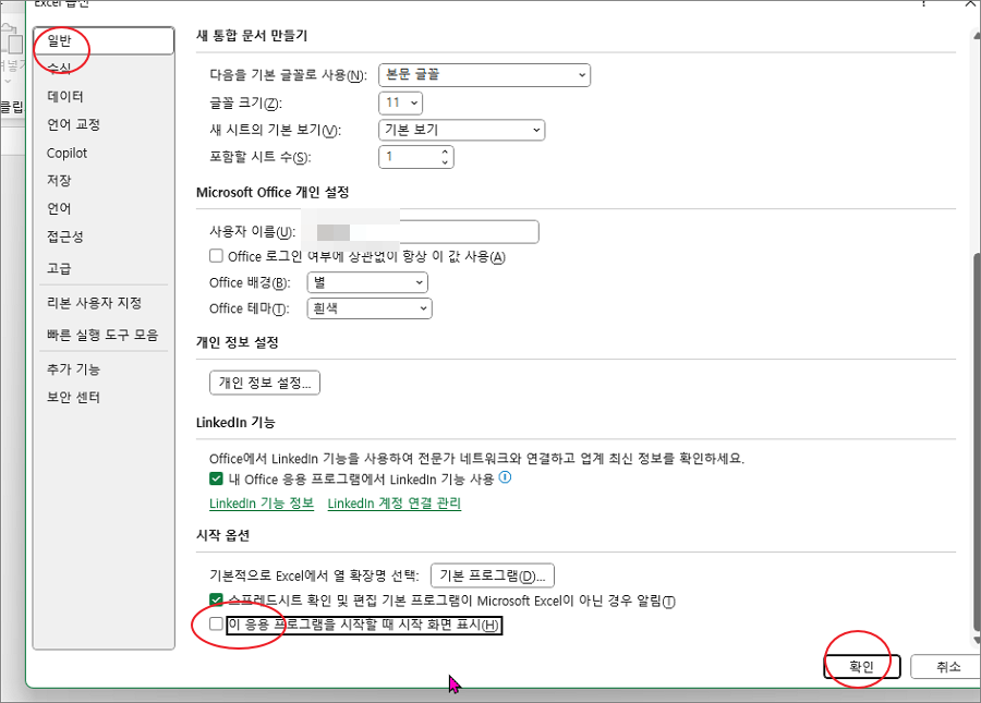 설정을 다시 원래대로 되돌리는 것도 간단합니다. 같은 방법으로 ‘파일 > 옵션 > 일반’에서 [이 응용 프로그램을 시작할 때 시작 화면 표시] 항목에 체크를 다시 하면 됩니다. 필요에 따라 유연하게 설정을 바꿀 수 있으니, 자신의 작업 패턴에 맞게 활용해보세요.