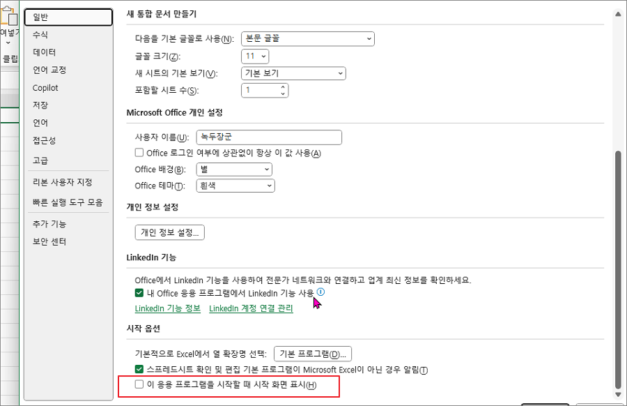 옵션 창에서 ‘일반’ 탭을 선택한 후, 아래쪽으로 스크롤하여 [이 응용 프로그램을 시작할 때 시작 화면 표시] 항목을 찾습니다.