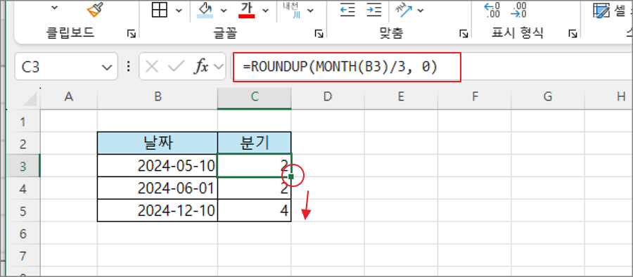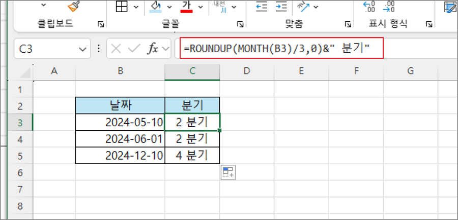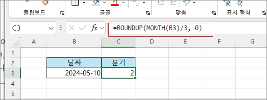 2. ROUNDUP 함수로 월을 기준으로 분기 구하기
