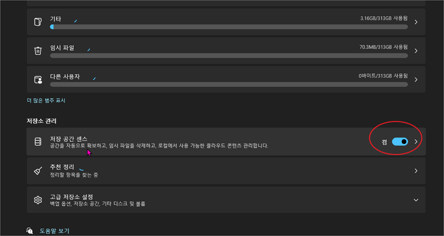 윈도우에는 자동으로 불필요한 임시 파일과 캐시 파일을 정리해주는 저장소 센스 기능이 있습니다. 이 기능을 켜두면 수동으로 정리하지 않아도 시스템이 항상 쾌적하게 유지됩니다. 설정 > 시스템 > 저장소 메뉴에서 저장소 센스를 켜고 정리 주기를 설정해두면 디스크 용량 부족 문제도 예방할 수 있습니다.
