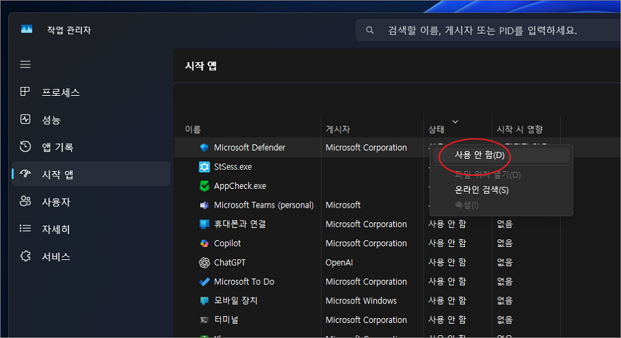 윈도우가 부팅될 때 자동으로 실행되는 앱이 많을수록 부팅 속도는 느려지고 메모리 점유율도 높아집니다. 불필요한 시작 프로그램을 비활성화하면 컴퓨터 시작 시간이 단축되고 리소스가 절약됩니다. 작업 표시줄에서 마우스 오른쪽 버튼을 눌러 작업 관리자를 실행한 후 시작 프로그램 탭으로 이동합니다. 목록에서 불필요한 항목을 선택하고 사용 안 함으로 변경합니다.