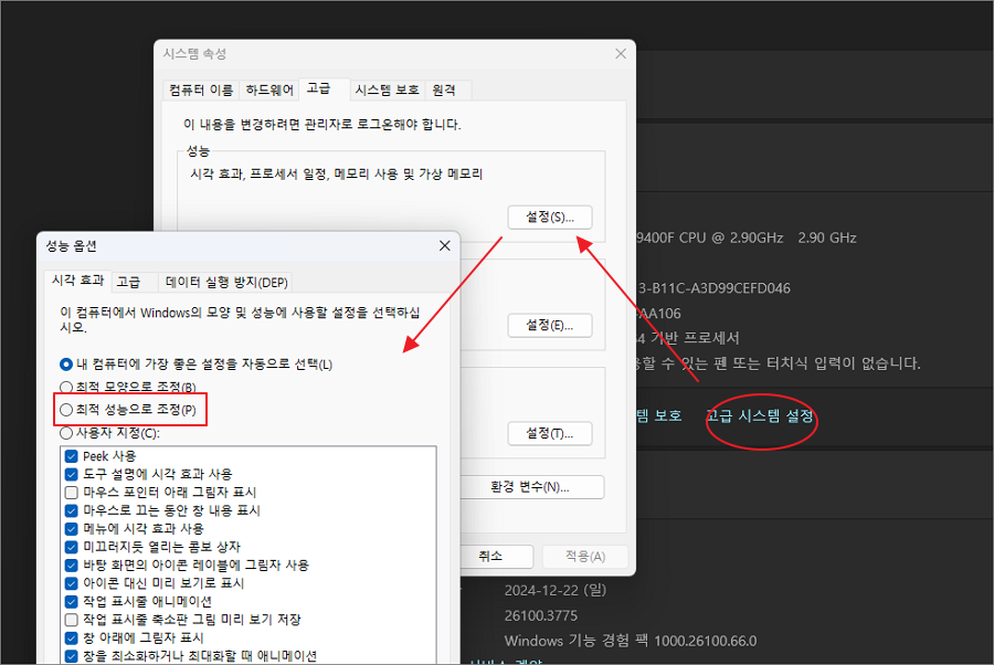시각 효과는 시스템을 더 부드럽고 세련되게 보여주지만, 그만큼 자원을 많이 소모합니다. 특히 사양이 낮거나 중간급인 PC에서는 시각 효과를 줄이는 것이 속도 개선에 효과적입니다. 설정 > 시스템 > 정보 > 고급 시스템 설정으로 들어가 성능 설정을 클릭한 후 시각 효과 탭에서 최적 성능으로 설정합니다. 또는 사용자 지정을 선택해 원하는 항목만 체크할 수 있습니다.