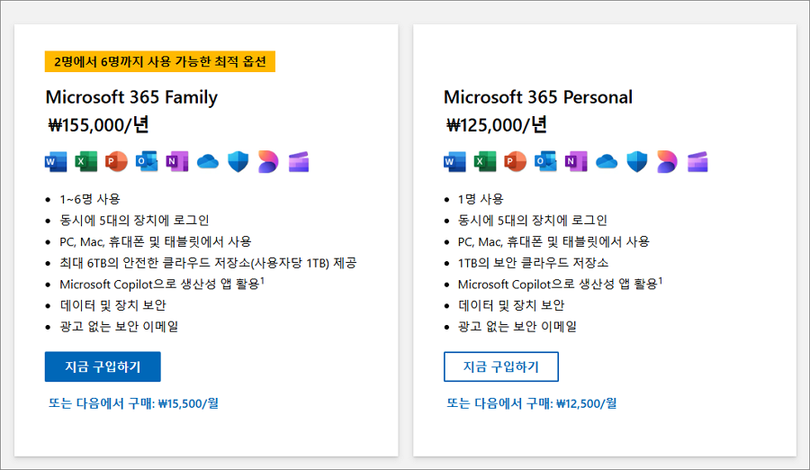 (2) Microsoft 365 Family: 최대 6인용, 연 ₩155,000 또는 월 ₩15,500
