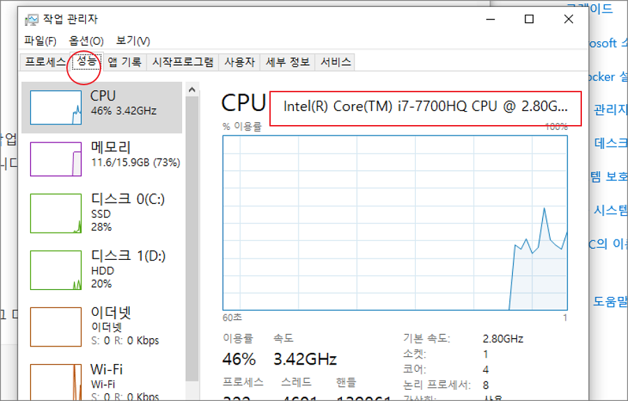 작업 중 리소스 사용량까지 함께 보고 싶을 때 유용합니다. 작업 표시줄에서 마우스 오른쪽 버튼을 클릭하거나 Ctrl + Shift + Esc 키를 눌러 작업 관리자를 실행합니다. 상단 탭 중 '성능'을 클릭하고 왼쪽에서 ‘CPU’를 선택하면 오른쪽 상단에 CPU 모델명이 표시됩니다. 여기에는 사용률, 코어 수, 스레드 수, 캐시 용량 등 추가적인 하드웨어 정보도 함께 확인할 수 있습니다.