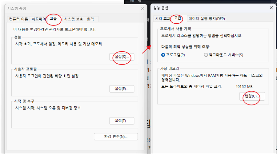1. 시스템 설정에서 가상 메모리 직접 조절하기
