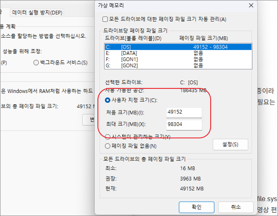 2. 권장되는 pagefile.sys 크기 설정