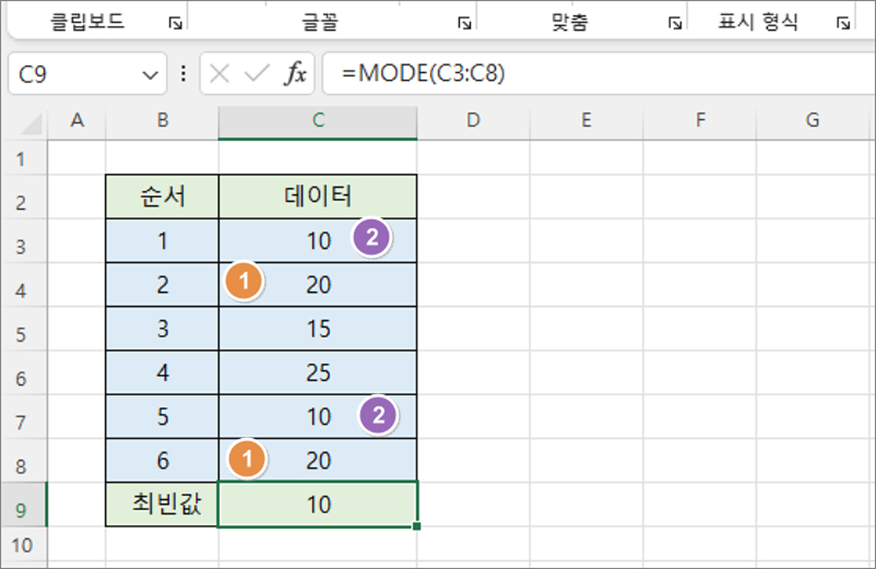 ▼ C3부터 C7까지의 숫자가 있는 범위에서 최빈값을 계산합니다. C8 셀에 “=MODE(C3:C7)” 수식을 입력하여 최빈값을 계산하였습니다. 결과로 20이 출력되며, 이는 범위에 있는 숫자에서 20이 가장 많이 나타나는 값입니다.