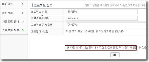 프로젝트 생성을 위한 기본값들을 입력하고 타인의 지적재산권이나 저작권 침해 관련