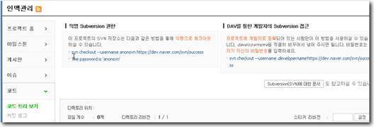 익명 : https://dev.naver.com/svn/[프로젝트ID] : The password is 'anonsvn'