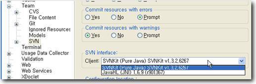 화면에서 아래쪽에 SVN interface 란이 있다. 콤보박스에 기본적으로 JavaHL 이 선택되어져