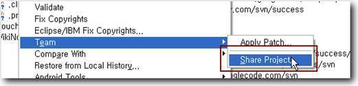 올릴 프로젝트를 선택하고 오른마우스 > Team > Share Project 를 선택한다.