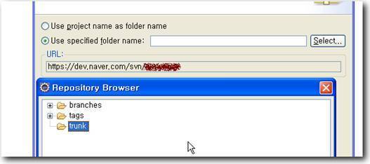 그래서 두번째 체크박스를 클릭해 타겟폴더를 trunk 밑으로 맞춘다.