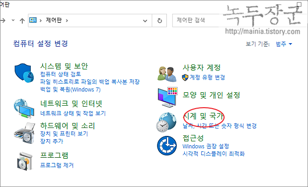 ▼ 제어판 목록에서 시계 및 국가 메뉴를 찾아 클릭합니다.
