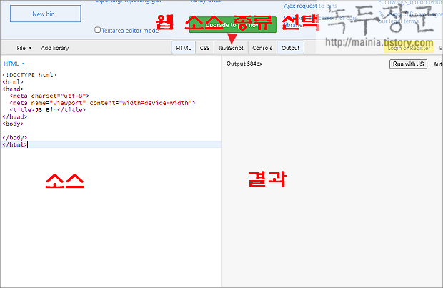 ▼ 먼저 Jsbin 사이트입니다. 아래 주소로 입력하면 아래와 같은 메인 화면을 볼 수 있습니다. 별도의 회원 가입 없이 바로 테스트해 볼 수 있습니다. 왼쪽 소스를 수정하면 오른쪽 패널 화면에 자동으로 반영됩니다. 상단 탭 버튼을 눌러 테스트할 소스의 편집화면을 오픈합니다.