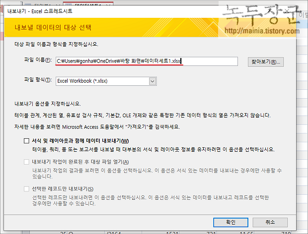 ▼ 내보내기 마법사에서 파일명과 위치를 지정하고 확인 버튼을 클릭합니다.