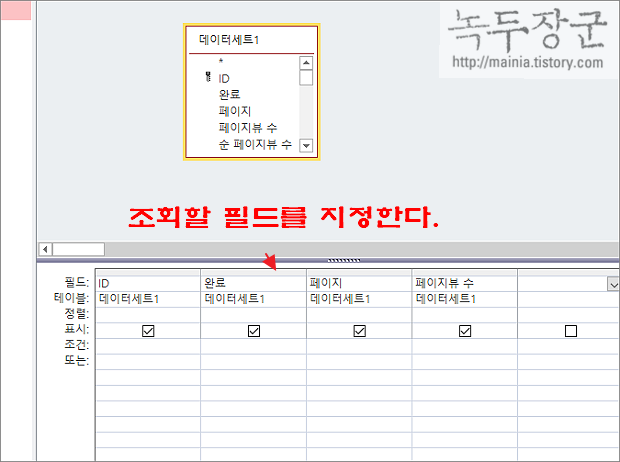 ▼ 쿼리 디자인 하단에는 추가한 테이블에서 어떤 필드값을 조회할 것인지 지정하는 옵션 화면이 있습니다. 테이블 항목의 박스를 클릭해서 조회할 테이블명을 지정합니다.