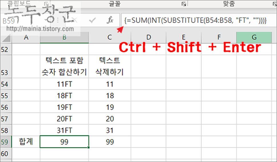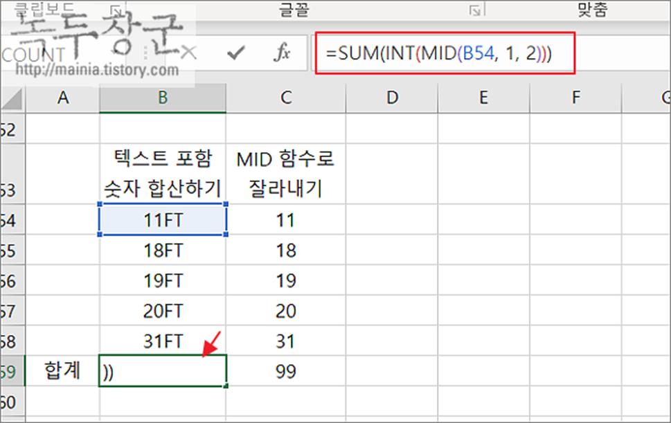 ▼ 다음으로 SUM, INT, MID 함수와 배열 수식을 이용해서 최종 결과값인 합계를 구해 보겠습니다. 위에서 숫자를 추출했던 수식과 SUM() 을 합쳐서 아래와 같이 만듭니다.