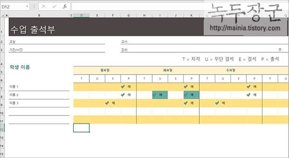 ▼ 먼저 하나의 포맷을 이용해서 매번 데이터를 삭제하고 다시 입력해야 하는 엑셀 작업이 있다고 합시다. 그림처럼 출석부 같은 경우 학생 이름과 출력 현황은 이전 학생과 다르기 때문에 한 번에 삭제하고 다시 입력해야 합니다.