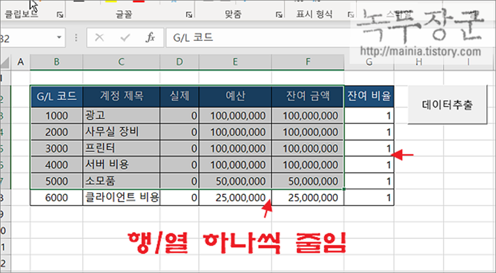 ▼ 위에서 작성한 함수를 실행해 보겠습니다. 엑셀 시트에서 “데이터 추출” 버튼을 누르면 기존 선택한 영역에서 행과 열을 하나씩 줄인 결과를 보여줍니다.