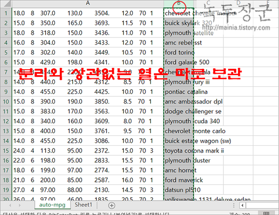 ▼ 한가지 유의할 점은 분리하는 열 외에 다른 데이터가 있다면 따로 보관해야 합니다. 분리 작업이 진행되는 동안 워크시트 전체를 삭제하고 다시 각 셀에 작업 데이터를 배치하기 때문입니다. 보관한 데이터는 작업이 끝나고 다시 붙입니다.