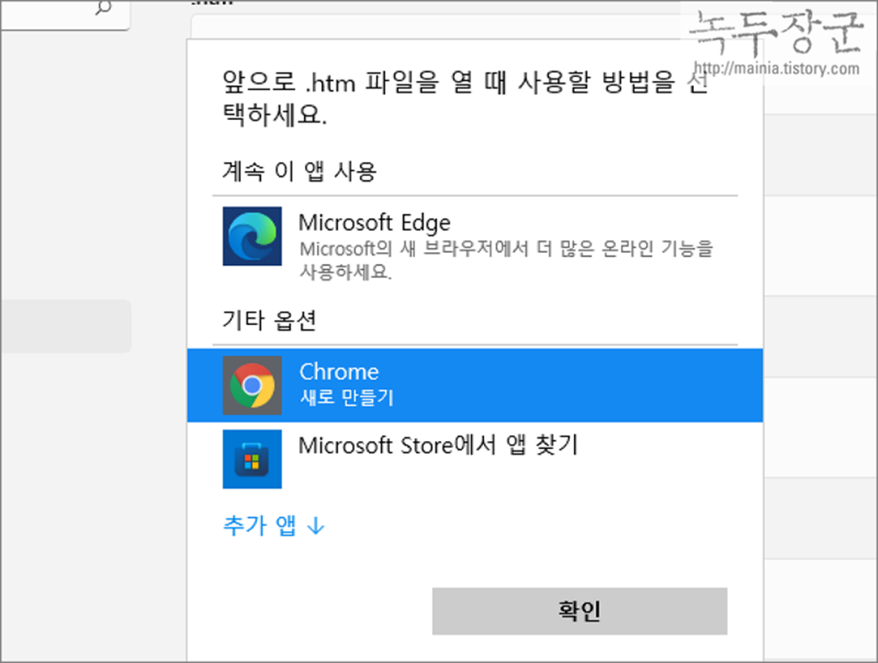 ▼ 다른 새 팝업창이 뜨면 확장자에 사용할 앱을 고릅니다. Chrome 을 선택하고 확인 버튼을 클릭합니다.
