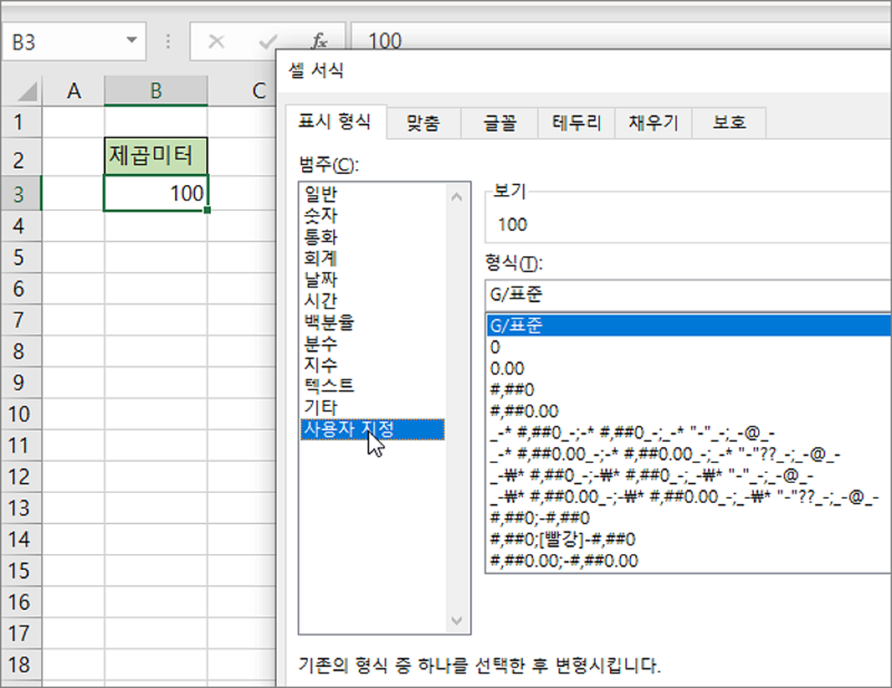 ▼ 셀 서식 창에서 범주 > 사용자 지정 으로 이동합니다. 그리고 형식에서 “G/표준” 뒤에 “ㄹ” 입력하고 “한자” 키를 눌러 특수문자 목록을 띄웁니다. 목록에서 m2 를 선택합니다.