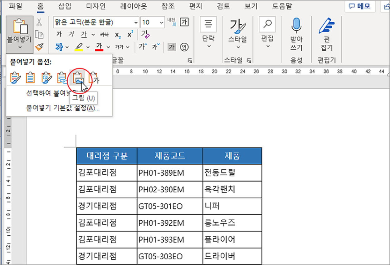 ▼ 세 번째는 그림 붙여넣기입니다. 엑셀에서 복사한 데이터와 스타일을 이미지로 변환해서 워드에 붙여 넣는 옵션입니다.