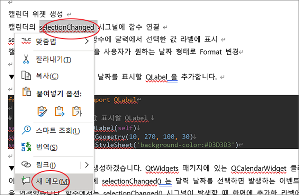 ▼ 먼저 메모를 하나 추가해 보겠습니다. 메모를 추가할 텍스트를 선택하고 오른쪽 마우스 > 새 메모 메뉴를 클릭합니다.