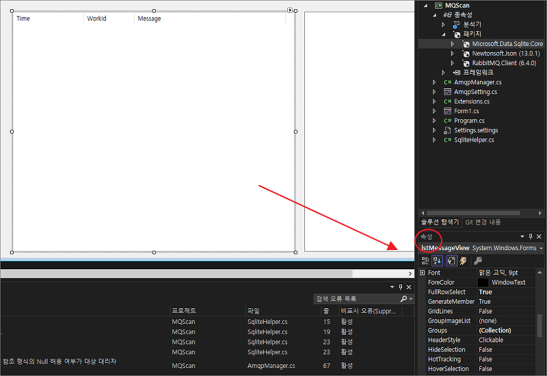 ▼ 먼저 리스트뷰(ListView) 컨트롤 목록 선택 이벤트에 콜백함수를 등록하겠습니다. 리스트뷰를 선택하고 오른쪽 하단에 뜬 속성 창으로 갑니다.