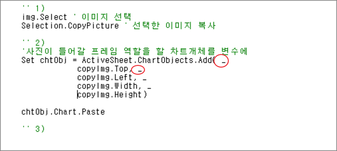 ▼ VBA 에서 긴 줄의 소스를 줄바꿈하기 위해서는 특수문자 언더바(_) 를 사용해야 합니다. 다른 개발언어와 달리 Enter 를 눌러 줄바꿈을 한다고 해서 적용되는 것은 아닙니다.